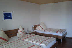 | Das Schlafzimmer bietet Platz für bis zu drei Personen. Ein weiters Bett befindet sich im Wohnzimmer hinter der Sitzgruppe. | ![]() ![]() |